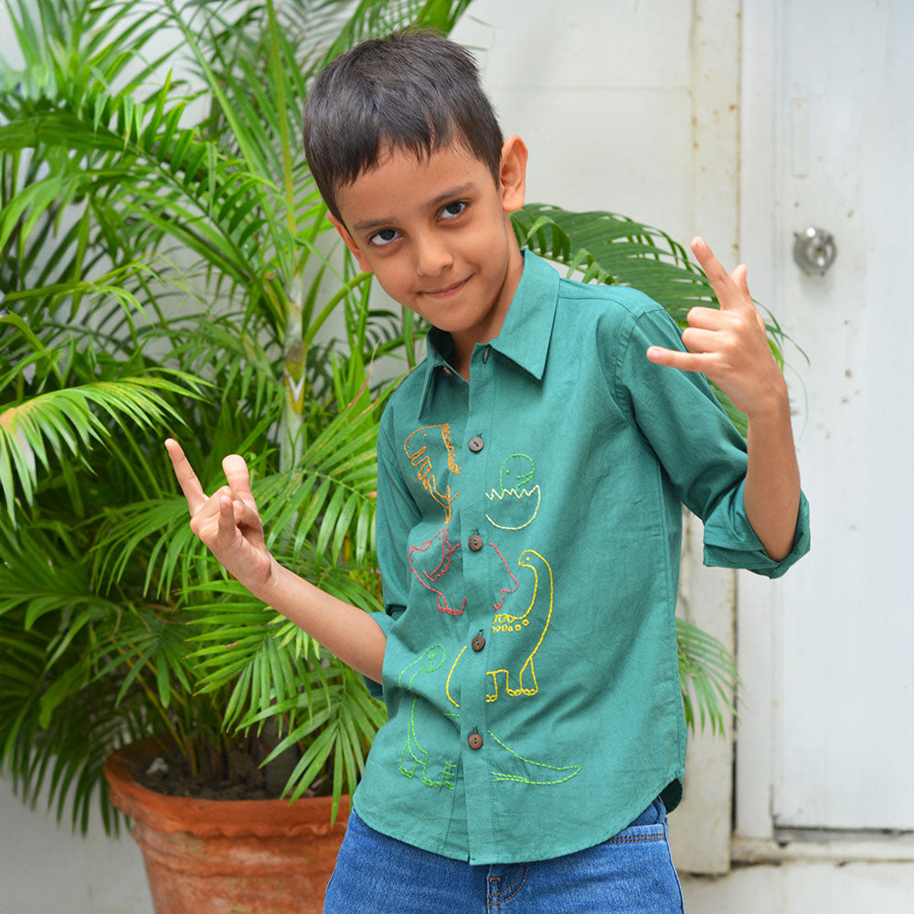 Dinosaurs Embroidered Shirt - Bottle Green